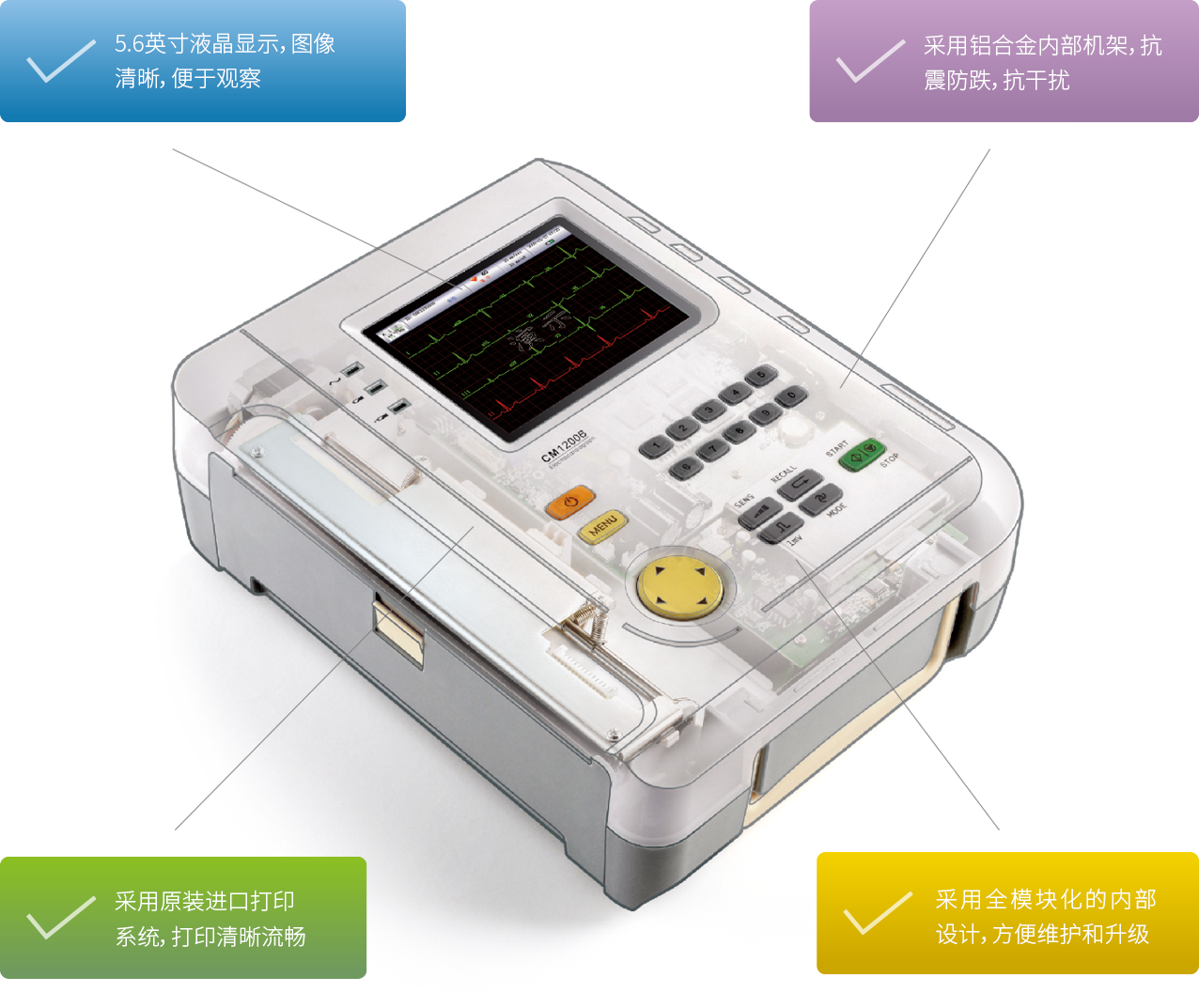 具有12×1、6×2+1R、3×4+3R,平均模板、自動(dòng)分析、自動(dòng)診斷報(bào)告等多種打印模式。