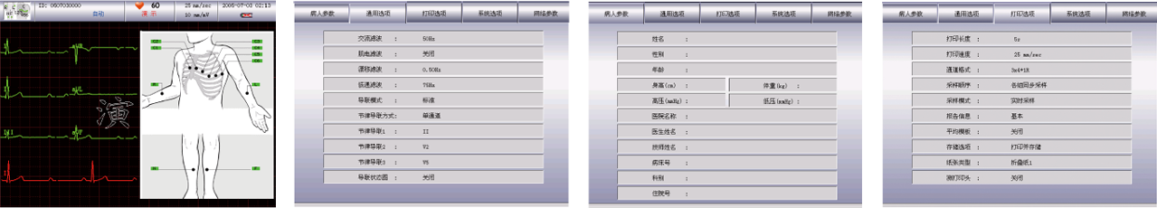 導(dǎo)聯(lián)連接示意圖 通用設(shè)置示意圖 病人信息輸入界面 打印設(shè)置界面